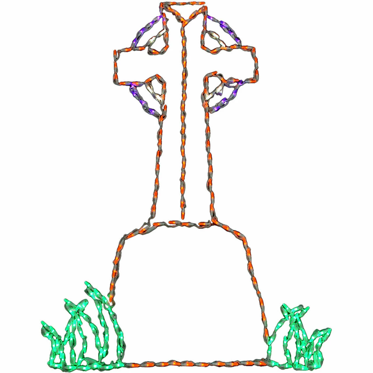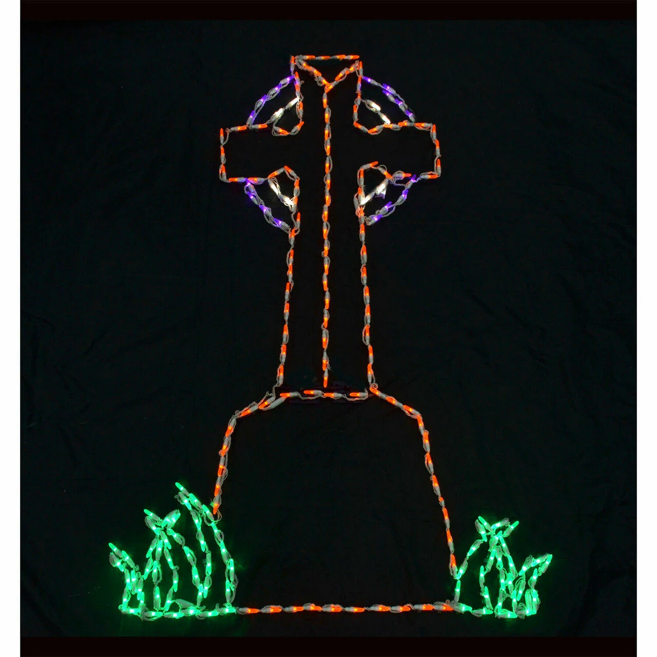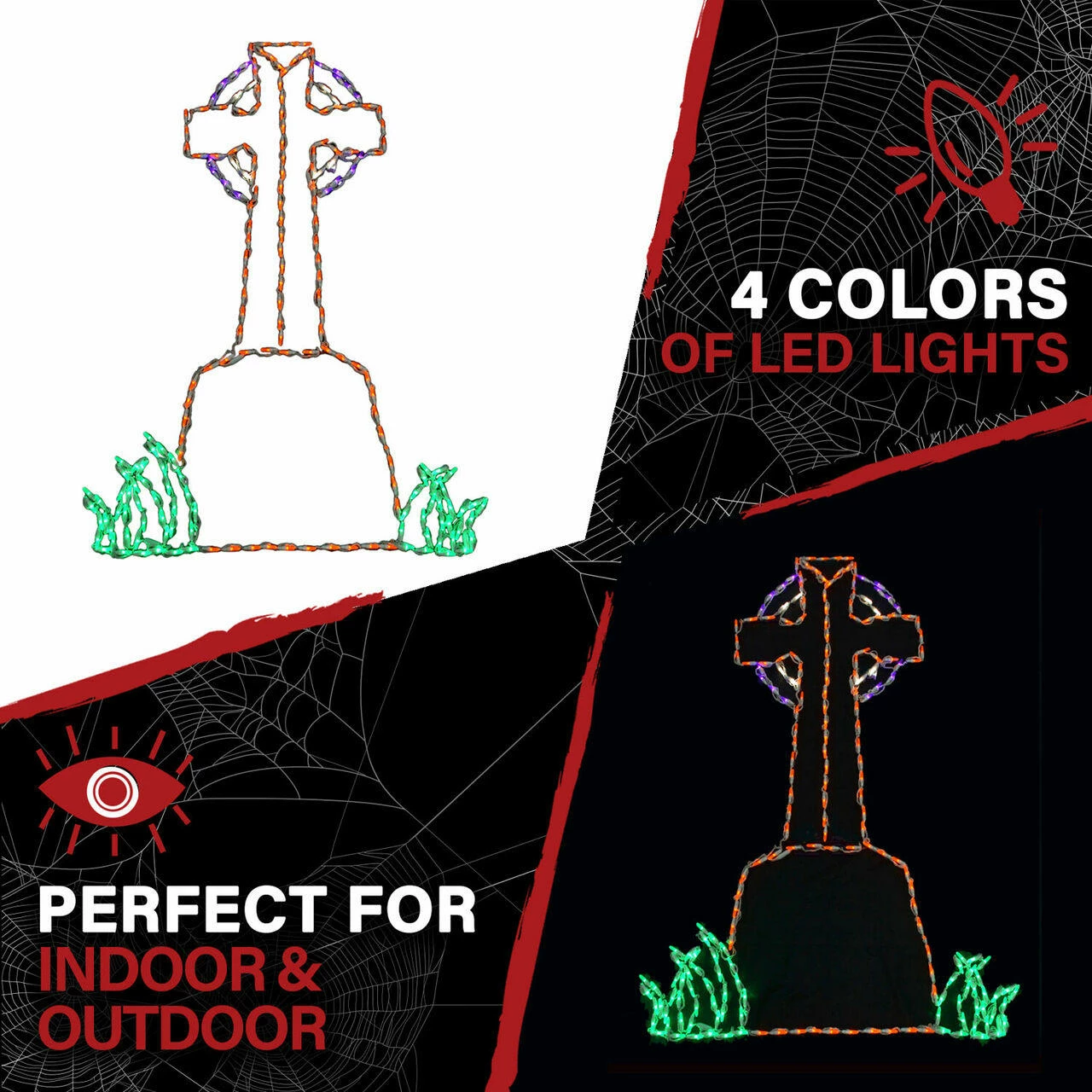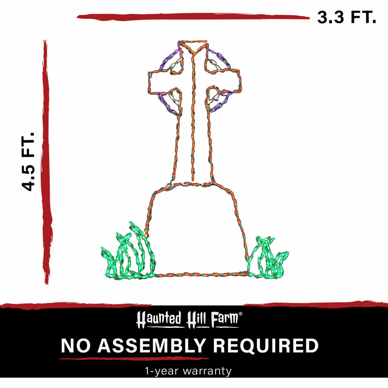 Light up the night with this giant Cross Tombstone light from Haunted Hill Farm! Our collection of spellbinding Halloween lights will help you create lots of eerie outdoor fun. Stake them on the lawn or mount them to the house for a frightfully spine-chilling decoration (stakes and other mounting hardware are NOT included). These pre-lit, weather-resistant shapes feature bright, faceted LED lights mounted on powder-coated metal frames to provide many years of happy haunting. Designed with 206 faceted lights, our tombstone is 39 inches wide by 54 inches tall. Pair it with our other spooky and scary lights (sold separately) to create a uniquely spirited display. For all your thrills and chills this Halloween season, count on quality products from Haunted Hill Farm.