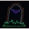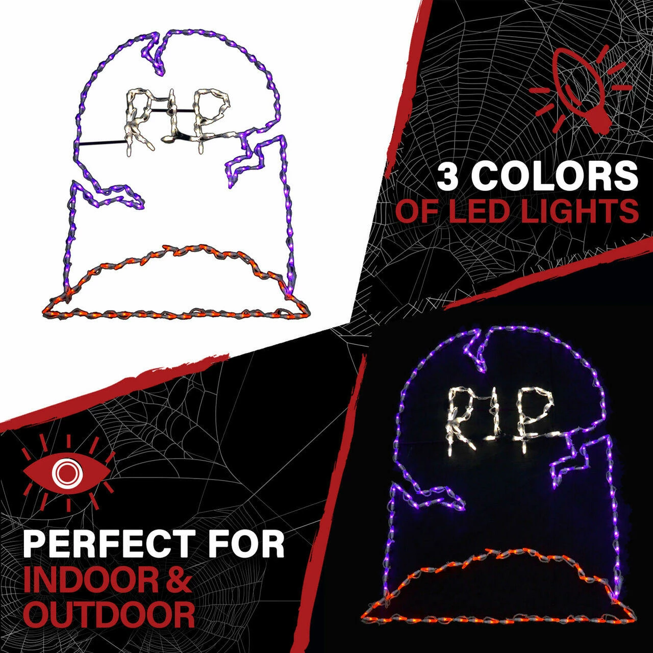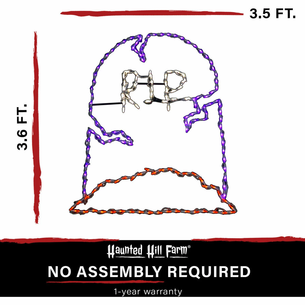 Light up the night with this giant R.I.P. Tombstone light from Haunted Hill Farm! Our collection of spellbinding Halloween lights will help you create lots of eerie outdoor fun. Stake them on the lawn or mount them to the house for a frightfully spine-chilling decoration (stakes and other mounting hardware are NOT included). These pre-lit, weather-resistant shapes feature bright, faceted LED lights mounted on powder-coated metal frames to provide many years of happy haunting. Designed with 165 faceted lights, our tombstone is 42 inches wide by 43 inches tall. Pair it with our other spooky and scary lights (sold separately) to create a uniquely spirited display. For all your thrills and chills this Halloween season, count on quality products from Haunted Hill Farm.