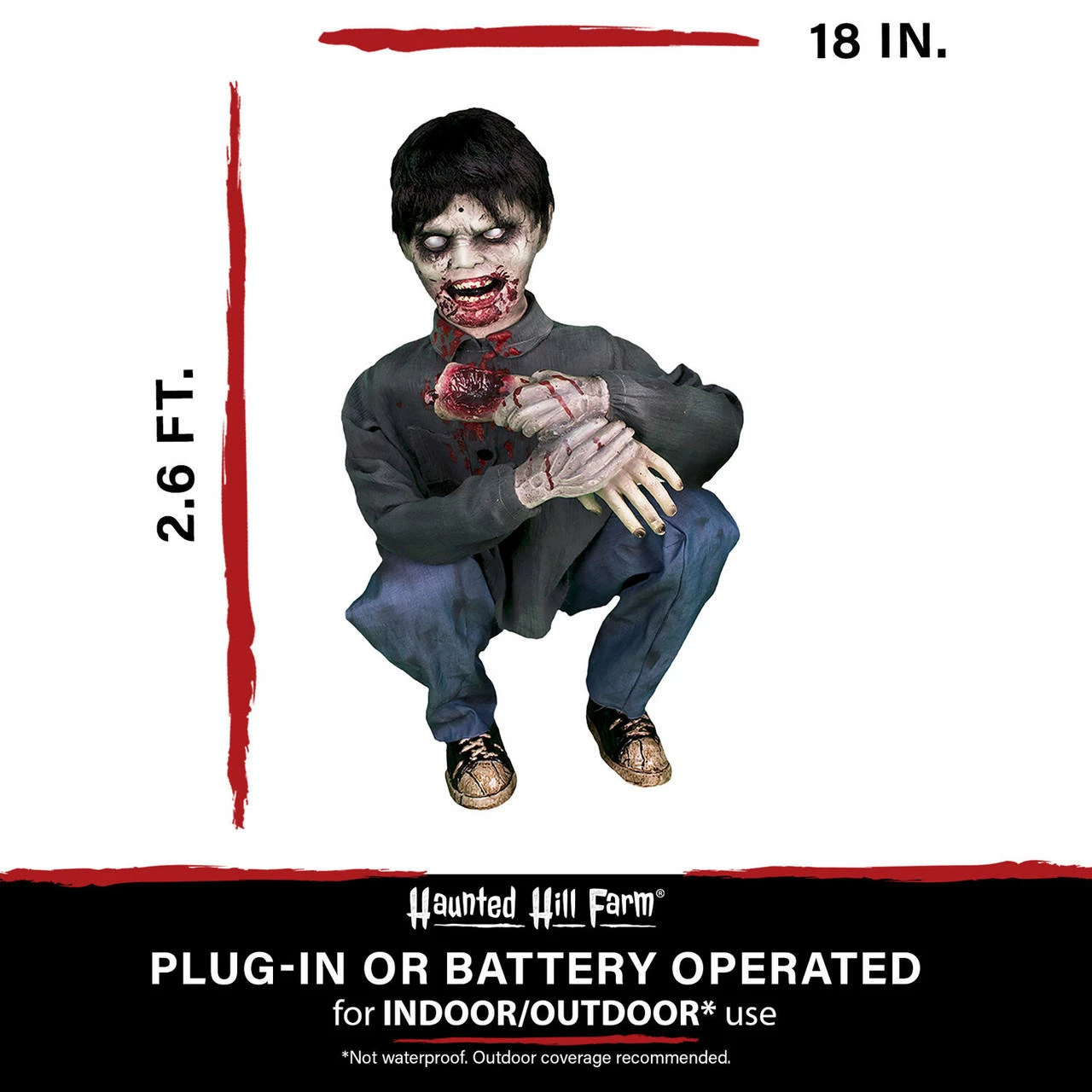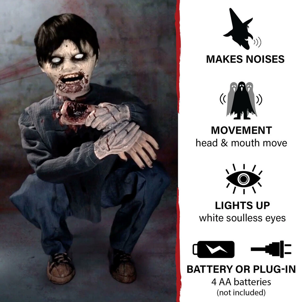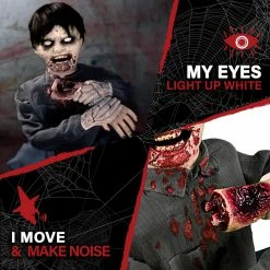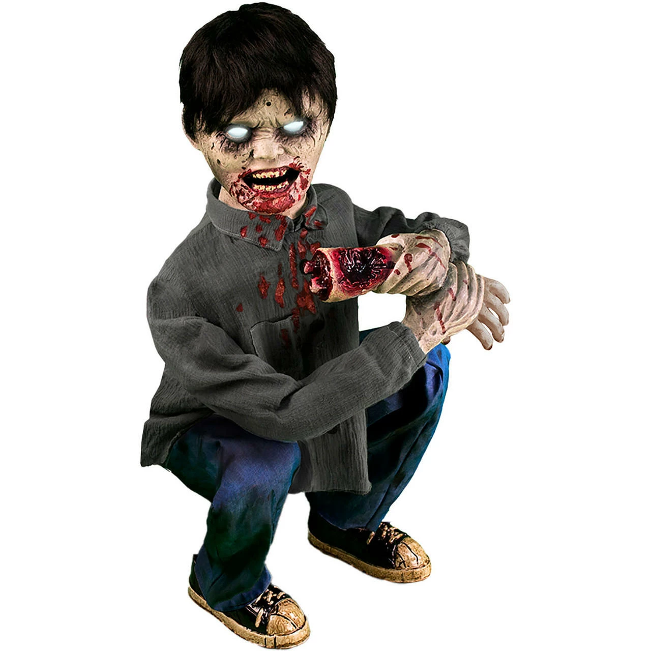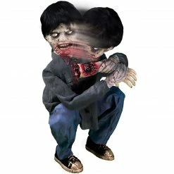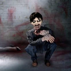 - Crouching limb-eating zombie boy with his bloody face and crunching sounds will terrify your trick-or-treaters