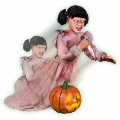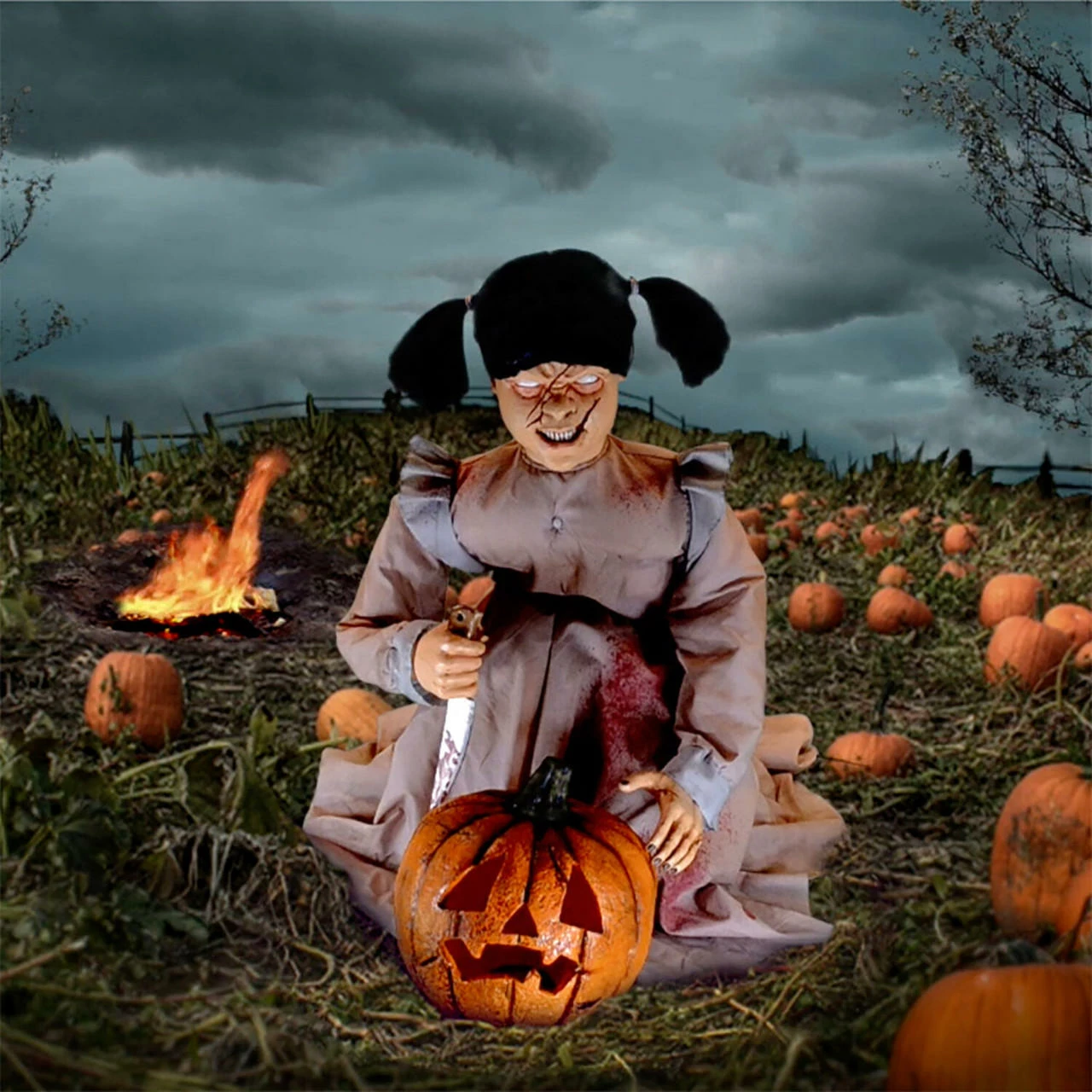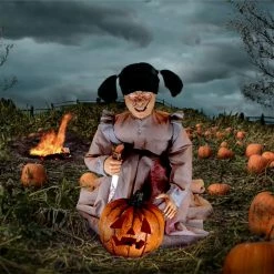 - Lunging pumpkin-carving zombie girl with her bloody knife and glowing Jack O’Lantern will terrify your trick-or-treaters