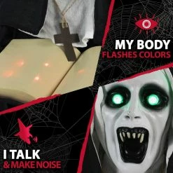 - Sister Dreadful is touch activated- talks, cackles evilly, eyes light up a demonic green