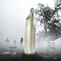Be afraid. Be very afraid of Haunted Hill’s Broken-Hearted collection. These blood curdling creatures are sure to terrify any trick-or-treaters, co-workers, or customers. Abandoned at the altar, Clarice the Clairvoyant is out for revenge. She can see your future, and if you get too close to her, it isn’t good? Clarice lingers in the night, moaning and moving her arms. Her eyes, streaked beneath with black teardrops, light up red as she searches for innocent souls. To give her an ideal view, position her on the included stand or suspend her from the hanging loop. No matter where she rests, her foreboding presence will trouble even the bravest trick-or-treaters. One look at her blood-red lips, long gray hair, and sinister expressionless face will stop visitors in their tracks. Her poseable arms end in hands so slender and sharp, they resemble talons. Her wedding garments are a haunting reminder of her deep sadness as Clarice pierces the darkness with white. Beware. Don’t let pity make you a fool. That is exactly what Clarice wants.