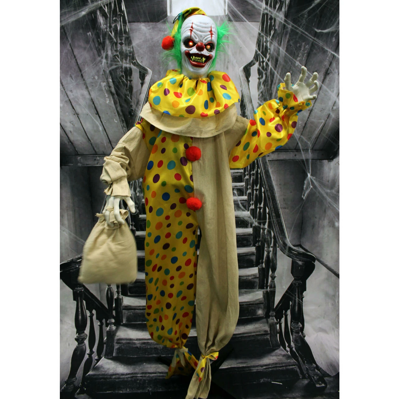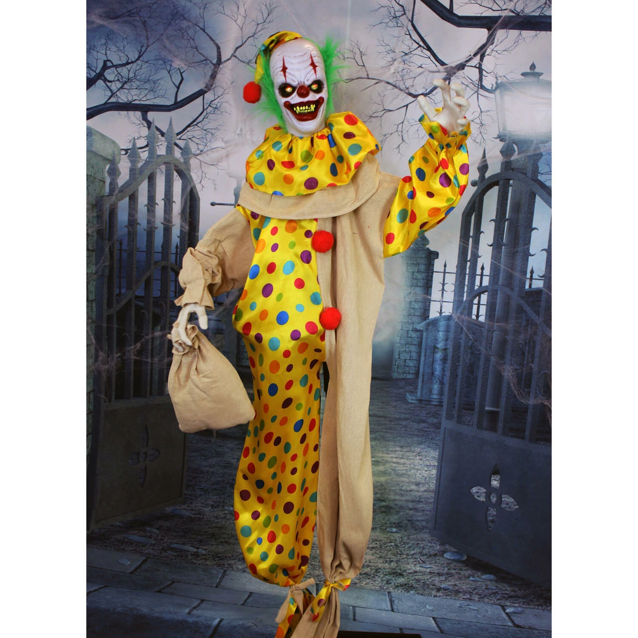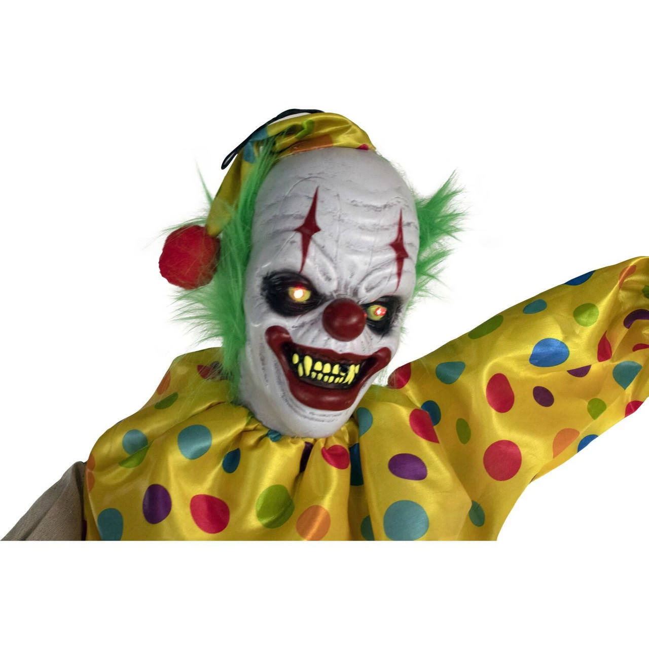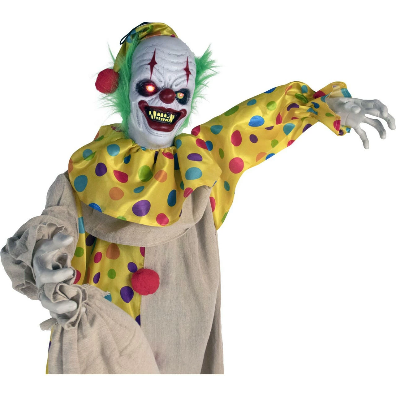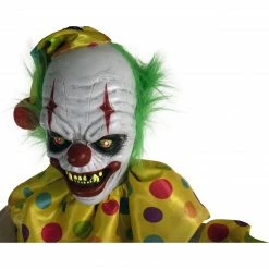Be afraid. Be very afraid of Haunted Hill’s Haunted Circus Collection. These blood curdling creatures are sure to terrify any trick-or-treaters, co-workers, or customers. “That’s it?come closer?? Snuggles the Clown urges. Approach him at your own risk. Snuggles was woken from a nap many years ago, and he now lurks in the darkness, unable to ever fall back asleep. His head moves as he taunts any who cross his path. The life-size clown torments victims from whatever position you choose; suspended from his hanging loop or stood upright on his stand. Snuggles’ arms are poseable to allow creepy creativity. His eyes flash red, illuminating his white face that contrasts with his round red nose, shocking green hair, and deep black eye-circles. His thick red lips are cracked in an evil smile, exposing his yellowing fangs. Dressed in a colorful polka-dot pantsuit and nightcap, Snuggles prowls the night carrying a pillow-case he no longer uses for rest. Don’t ask him what’s inside, or you might just find out? Forgive him. Hundreds of sleepless years would leave you in a bad mood too.