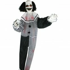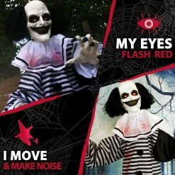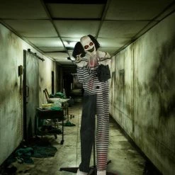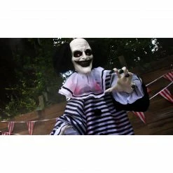 Be afraid. Be very afraid of Haunted Hill’s Haunted Circus Collection. These blood curdling creatures are sure to terrify any trick-or-treaters, co-workers, or customers. “Come closer?” Fester the Clown will say. With a wide eyed smile, he beckons, this way! But beware-he doesn’t want to play? Don’t be fooled by Fester’s grin. Whether suspended from his hanging loop or stood upright on his stand, his moving life-sized body will chill visitors to the bone. As his eyes flash a sinister red, they cast light on his dark hair and ghostly pale face. His thick black lips are stretched in a smile so wide, it reveals his yellowing teeth. Fester certainly looks excited, but you should be scared. To add to Fester’s upbeat appearance, re-position his poseable arms. Reach them outwards to tempt victims near or bend them straight up to give him a petrifying playful look. If not for his blood-stained pant suit, one might think Fester seems…friendly? That’s just what he wants.