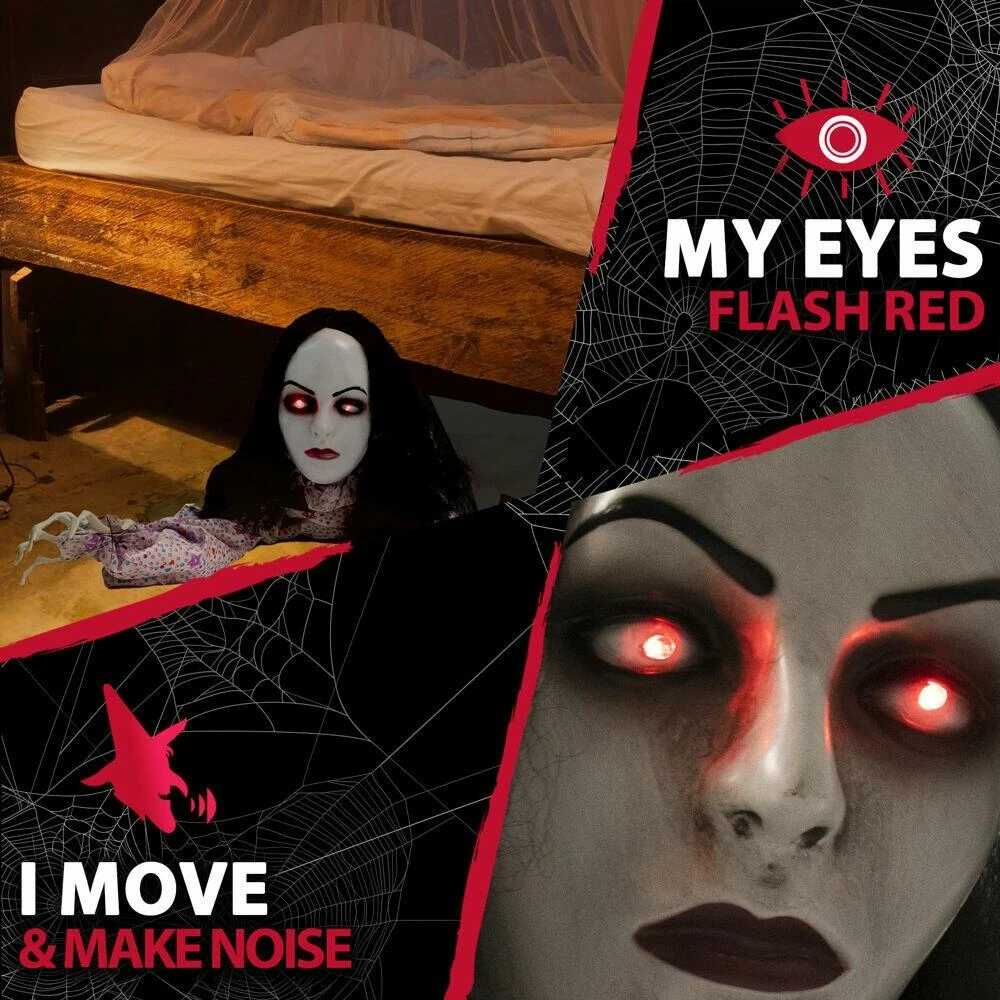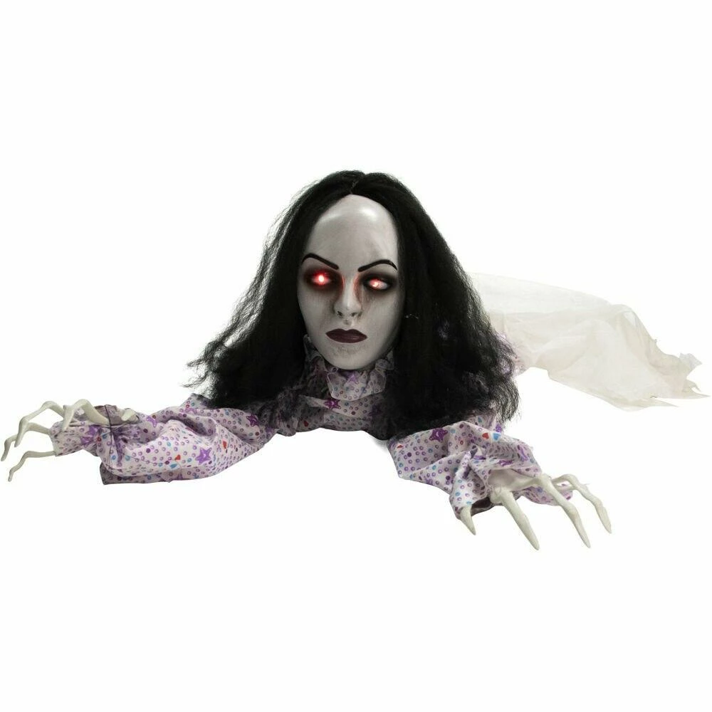 Be afraid. Be very afraid of Haunted Hill’s Crawler collection. These blood curdling creatures are sure to terrify any trick-or-treaters, co-workers, or customers. Ethel the Dream Demon will haunt you?even when you’re not asleep. Killed in her bed many years ago, she will let no one around her rest. Ethel crawls across the floor, slipping from room to room and bringing scares wherever she goes. Her flashing red eyes and haunting moans will fill the night with terror. Don’t gaze too long at her expressionless face. Her pale skin, red lips, and wild black hair are hard to forget. Skeleton-like hands reach out from the sleeves of her nightgown, gliding along the ground as she hunts for innocent souls. Invite Ethel to be the perfectly petrifying finishing touch to your haunted house this Halloween!Ethel the Dream Demon will haunt you?even when you’re not asleep. Killed in her bed many years ago, she lets no one around her rest. Ethel crawls across the floor, slipping from room to room and bringing scares wherever she goes. Her flashing red eyes and haunting moans fill the night with terror. Don’t gaze too long at her expressionless face. Her pale skin, red lips, and wild black hair are hard to forget. Skeleton-like hands reach out from the sleeves of her nightgown, gliding along the ground as she hunts for innocent souls. Invite Ethel to be the perfectly petrifying finishing touch to your haunted house this Halloween! She is more than happy to cause some nightmares…