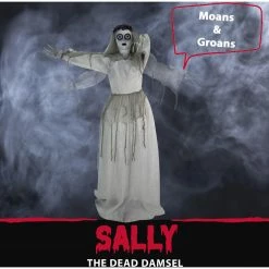 Be afraid. Be very afraid of Haunted Hill’s Broken Hearted Collection. These blood curdling creatures are sure to terrify any trick-or-treaters, co-workers, or customers. Sally the Dead Damsel is screaming for attention this Halloween. Since the day she was left at the altar, she vowels vengeance on those who cross her path. Her long poseable arms and skeleton-like hands reach out and her large, red flashing eyes show the torment she feels. She may not speak clearly, but her moans and screams fill the night sky with horror and fear. She is draped in the reminiscence of her bridal gown and a gray and white flower crown adorns her long white hair. Hang Sally from your porch or prop her on her stand next to your holiday treats. No matter where she rests, one glance at her soulless eyes, contrasting lips, and ghostly skin will chill visitors to the bone. Sally the Undead Damsel is the cruel finishing touch to your Haunted House this Halloween!