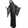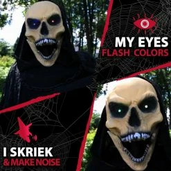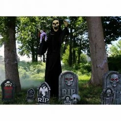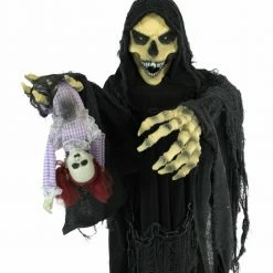 Be afraid. Be very afraid of Haunted Hill’s Reaper collection. These blood curdling creatures are sure to terrify any trick-or-treaters, co-workers, or customers. Masked beneath a black cloak, Frank the Reaper blends into the darkness, stalking his victims with ease. His eerie moans, shrieks, and bubbling sounds will terrify any unfortunate passerby. Frank’s eyes flash an alarming array of multi-colors, casting a glow of terror throughout the night. The dark hooded figure clutches a doll in one hand in hopes of tempting victims near with promises of fun and games. Frank can be suspended by his included hanging loop or perched on his stand next to your holiday treats. No matter where he rests, his presence will be felt by all. Invite Frank to your home this Halloween, but be warned. It’s not candy he wants to collect…