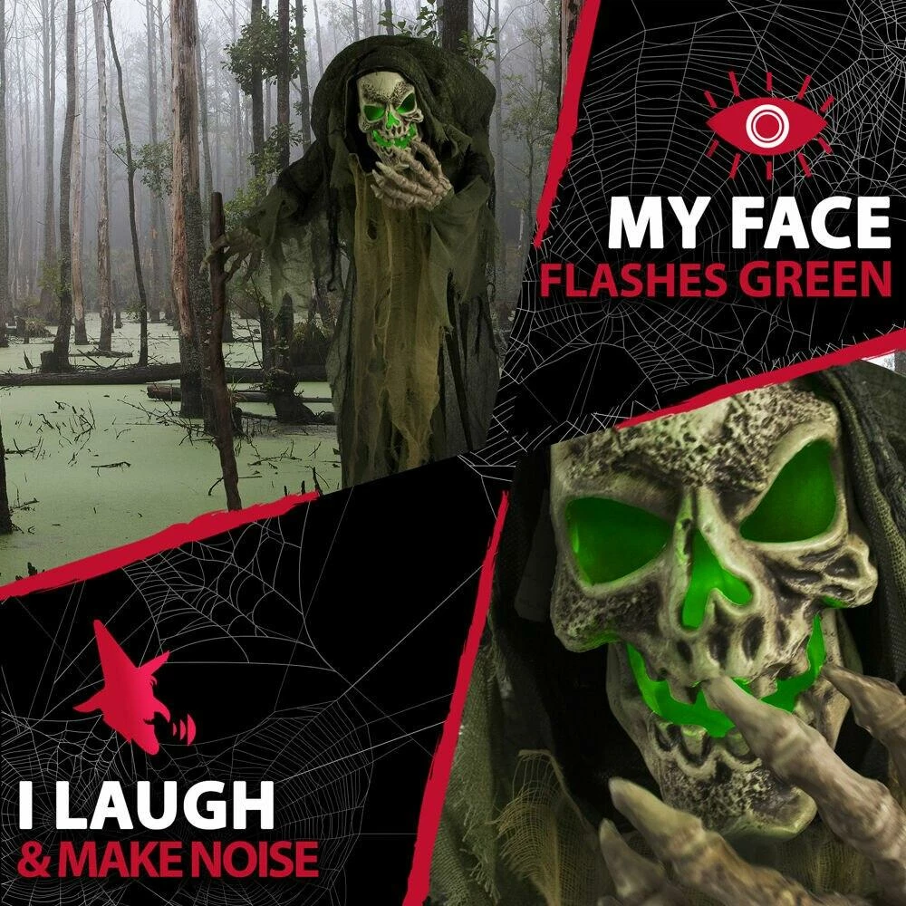 Be afraid. Be very afraid of the Haunted Hill’s Reaper collection. These blood curdling creatures are sure to terrify any trick-or-treaters, co-workers, or customers. Jinx the Reaper isn’t collecting candy this Halloween? he’s after something much, much, more valuable? Hungry for souls, Jinx is unable to mask his gleeful excitement. His skeleton head moves as he chuckles into his hand. His face glows green from within, illuminating his wicked grin, nose, and gaping eyes. The hunched monster hunts in the night either suspended from his hanging loop or perched on his stand. His eerie appearance is complete with a walking stick and tattered cloak. Best think twice before approaching Jinx. He’s been quite anxious for some? company.