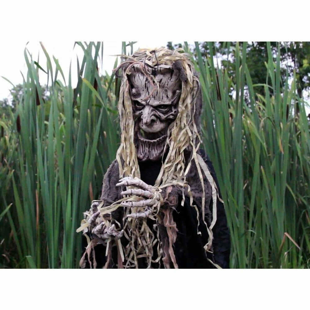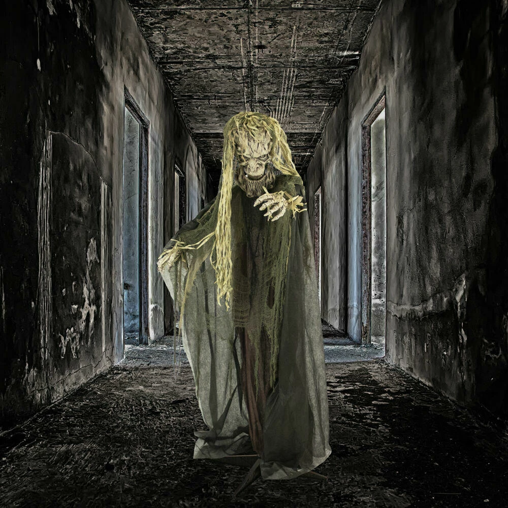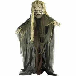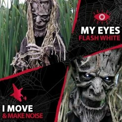 Be afraid. Be very afraid of the Haunted Hill’s Haunted Cornfield Collection. These blood curdling creatures are sure to terrify any trick-or-treaters, co-workers, or customers. Terry the Terrible Tree-Man is, well?terrible. Cursed centuries ago, Terry is forced to live in half human, half tree, form. He’s out for vengeance, and cares little about where his anger is directed. This life-sized monster is touch activated. When he senses victims, he laughs wickedly and taunts the poor souls. As he speaks, Terry’s mouth moves and his glowing white eyes blink. His bendable arms are complete with skeleton hands, and his straw-like hair, knobbly face, toothy grin, and tattered cloak make Terry the most terrifying tree-or man-around this Halloween. Terry can torment visitors while suspended from his hanging loop or perched on his stand. It doesn’t matter to him, as long as there are innocent souls to terrify.