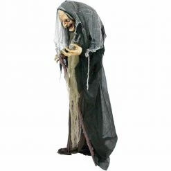 Be afraid. Be very afraid of Haunted Hill’s Curses and Cauldrons Collection. These blood curdling creatures are sure to terrify any trick-or-treaters, co-workers, or customers. Esther is not afraid to show the true face of Halloween and even the most fearless will cower in horror. Her eyes glow an ominous red as she mocks those who cross her path. Esther gazes down at them with a wicked toothy grin as her head moves up and down in a laughing way. The tattered earth toned clothes she wears falls to the floor, masking Esther’s body in the night. Her arms bend into a variety of scary positions and are finished with realistic hands holding a wood-like staff. If you approach her, don’t expect her advice to be kind. “Is that a mask?? Esther says.