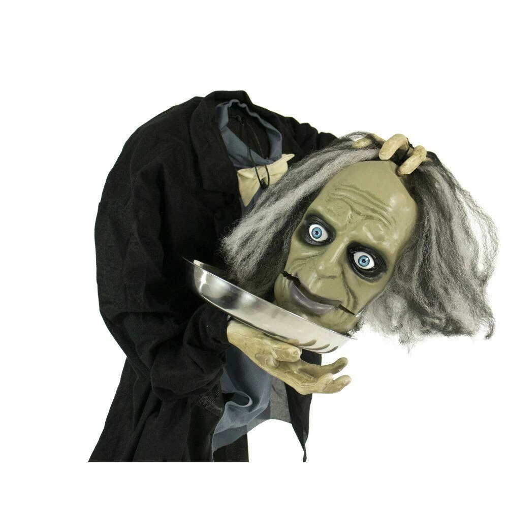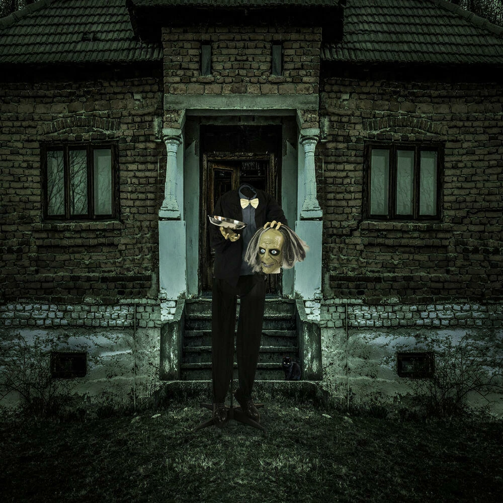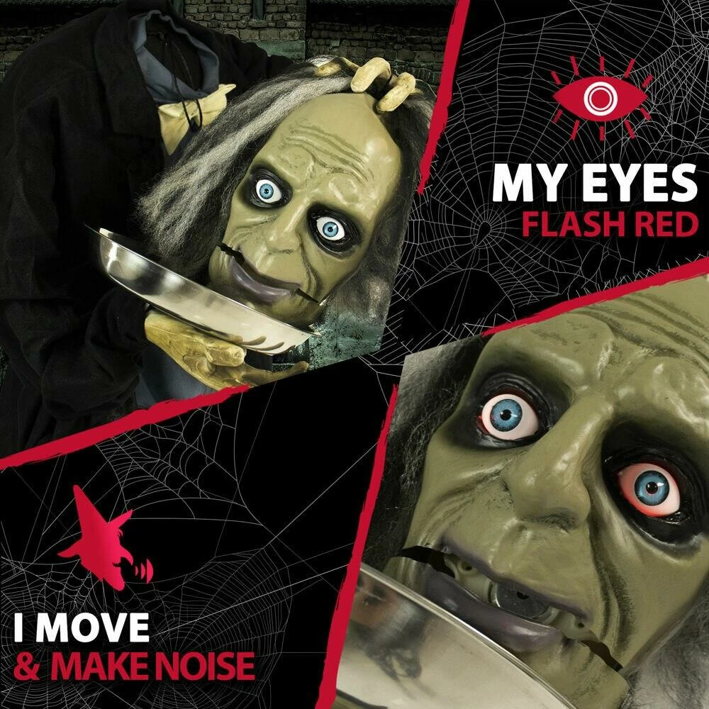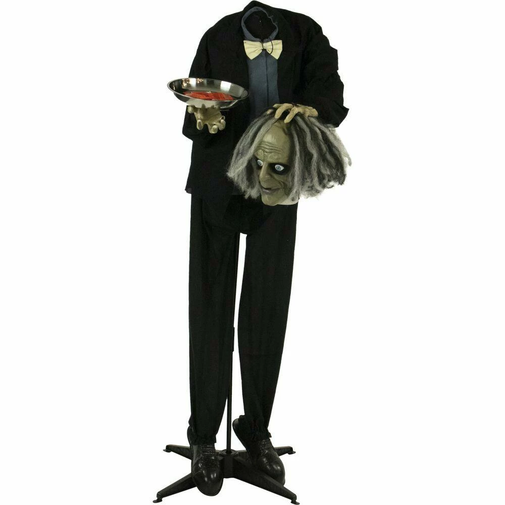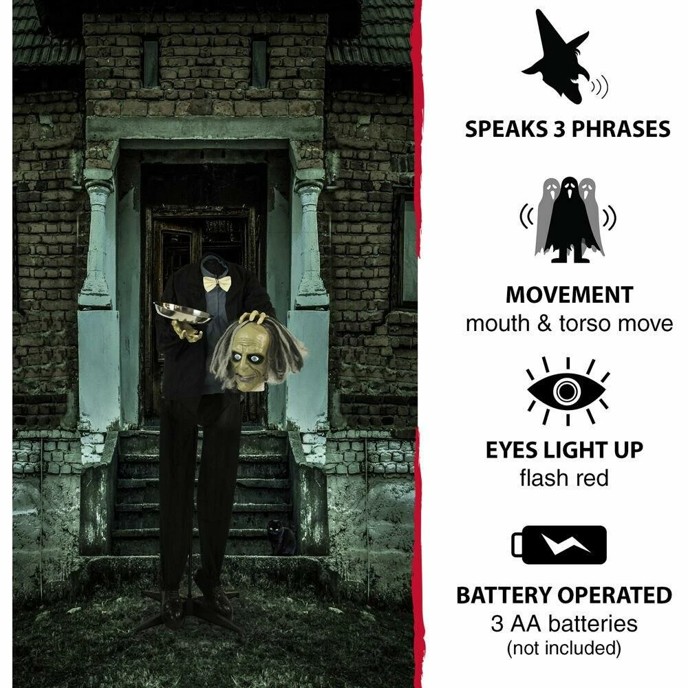 Be afraid. Be very afraid of Haunted Hill’s Lawn of the Dead Series. These blood curdling creatures are sure to terrify any trick-or-treaters, co-workers, or customers. Herald the zombie butler is headless and horrifying. He insists on continuing work, even after his unfortunate decapitation. Guests will be alarmed when Herald’s torso rotates on his body as his eyes light up a fearsome red. His mouth moves as he beckons visitors closer, urging them to follow him to the graveyard. The head clutched in his hand is complete with gruesome green skin, wild gray hair, and a sinister smile. It can be placed in a variety of positions, including on the silver tray Herald holds. The tray also makes for a perfect candy spot. Pose Herald’s bendable arms to extend the platter to guests or keep it close, forcing trick-or-treaters near. Visitors– don’t be fooled. Although Herald is dressed in a suit, his intentions are far from professional. “Beware,? he warns. It would be wise to listen.