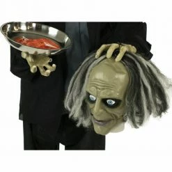 - Head clutched in hand complete with gruesome green skin, wild gray hair, and sinister smile